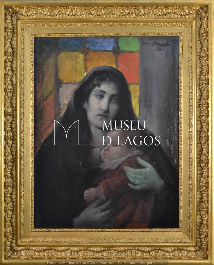 A pintura representa um mulher de meio corpo e de frente, usando manto preto a cobrir a cabeça e as costas. Segura nos seus braços um bebé adormecido sobre o seu peito. A pintura possui a moldura original.
