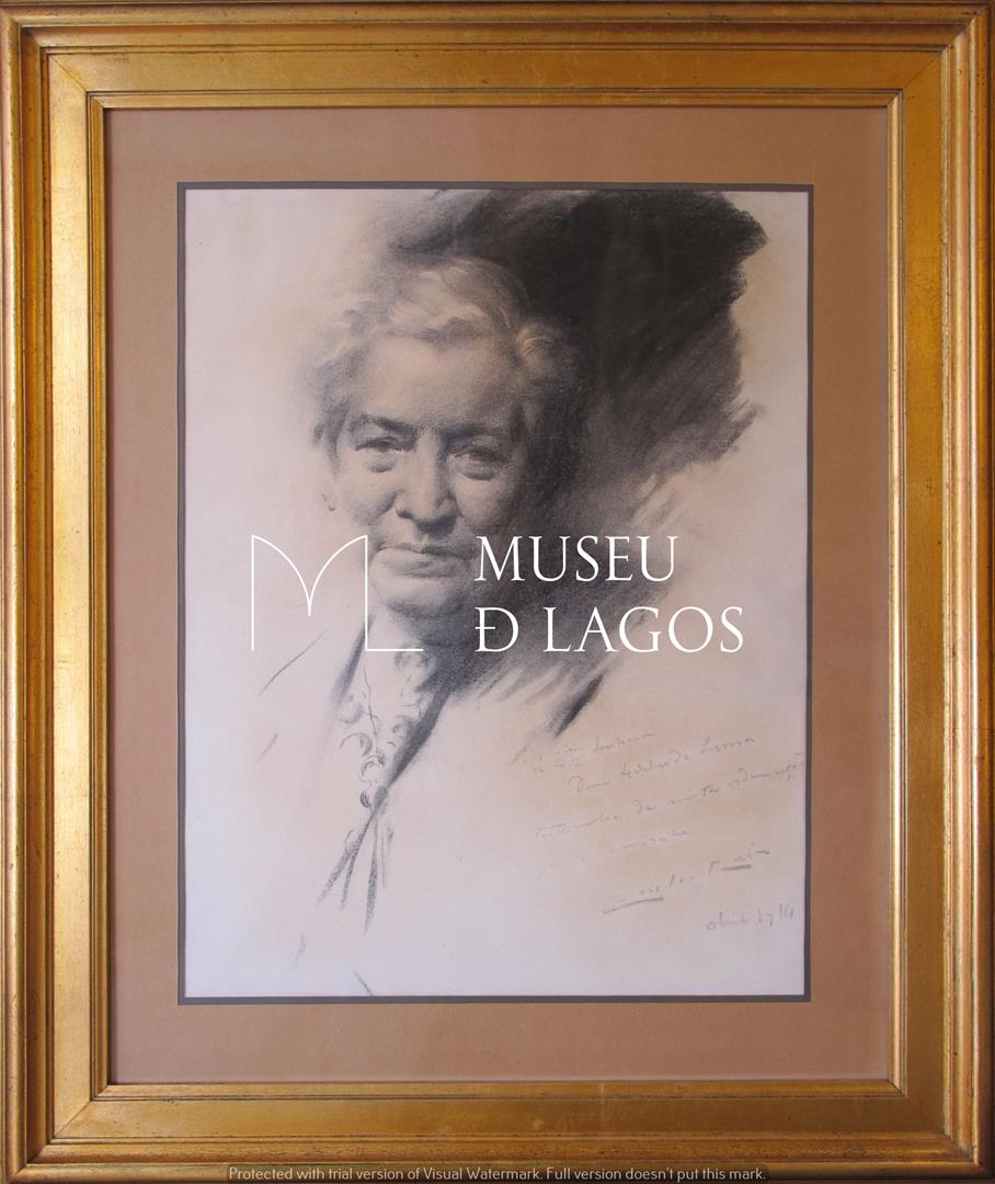 Retrato de meio corpo, representando Adelaide Lima Cruz. No canto inferior direito observa-se uma dedicatória do autor. O desenho possui a moldura original.