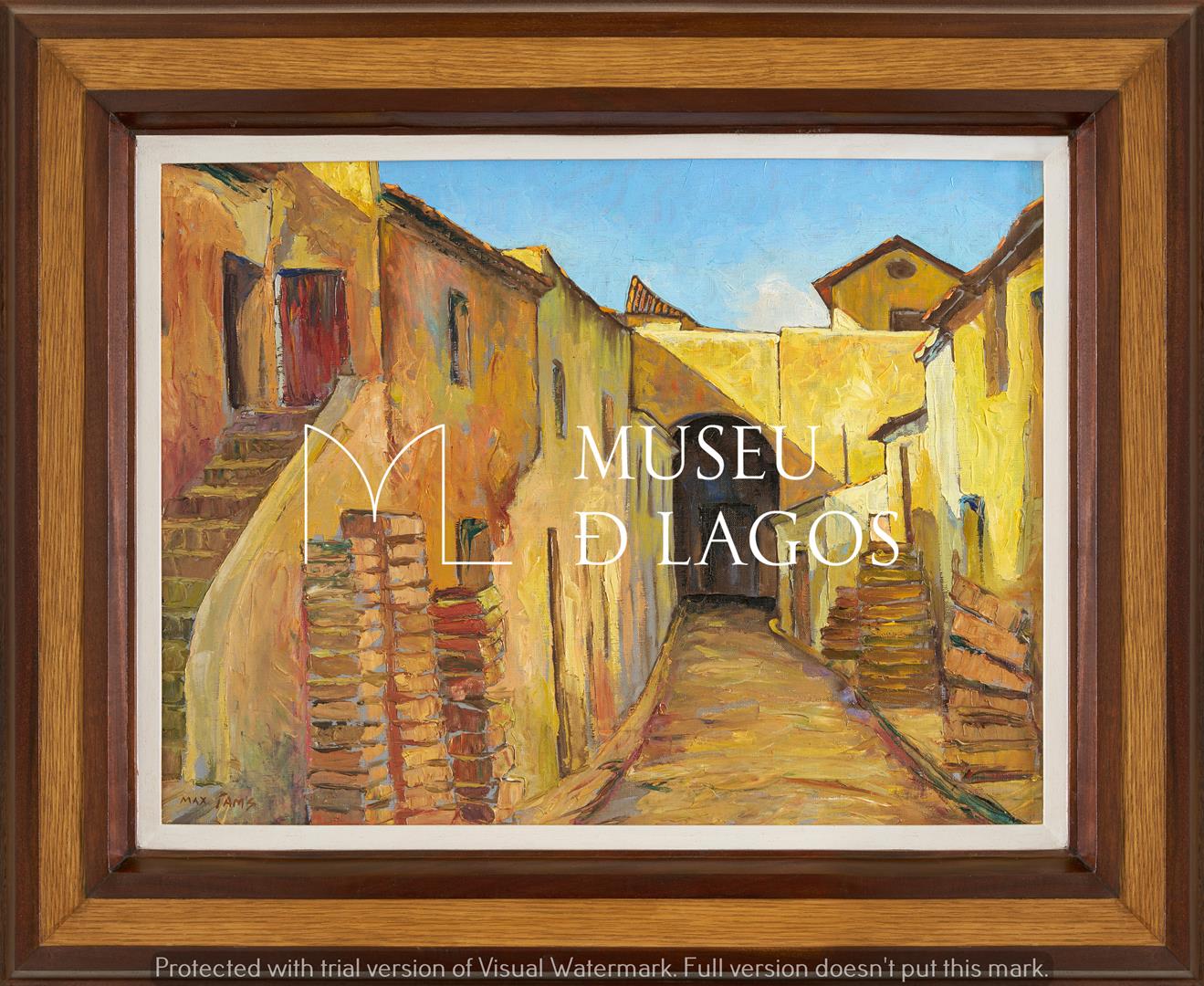 A pintura representa o antigo Bairro da Ribeira em Lagos. Ao centro a rua é estreita e ladeada por habitações, que possuem junto às suas paredes exteriores caixas de madeira empilhadas. Ao fundo vizualiza-se uma parte de pano de muralha com um dos seus arcos. A pintura possui moldura original.