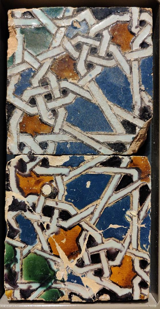 Seção de azulejos composta por duas peças de forma quadrada. Cada azulejo é decorado com elementos geométricos, formando laçarias. Policromia: azul, branco, verde e castanho. Faz conjunto com nº inv. 9616